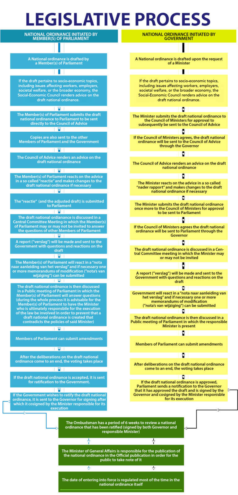National ordinances contain general binding regulations which in certain cases have far reaching consequences for the citizens of the country like for example the raising of taxes and criminalizing certain behavior. These types of decisions cannot be taken lightly and require a lot of preparation before these decisions are laid down in a national ordinance.